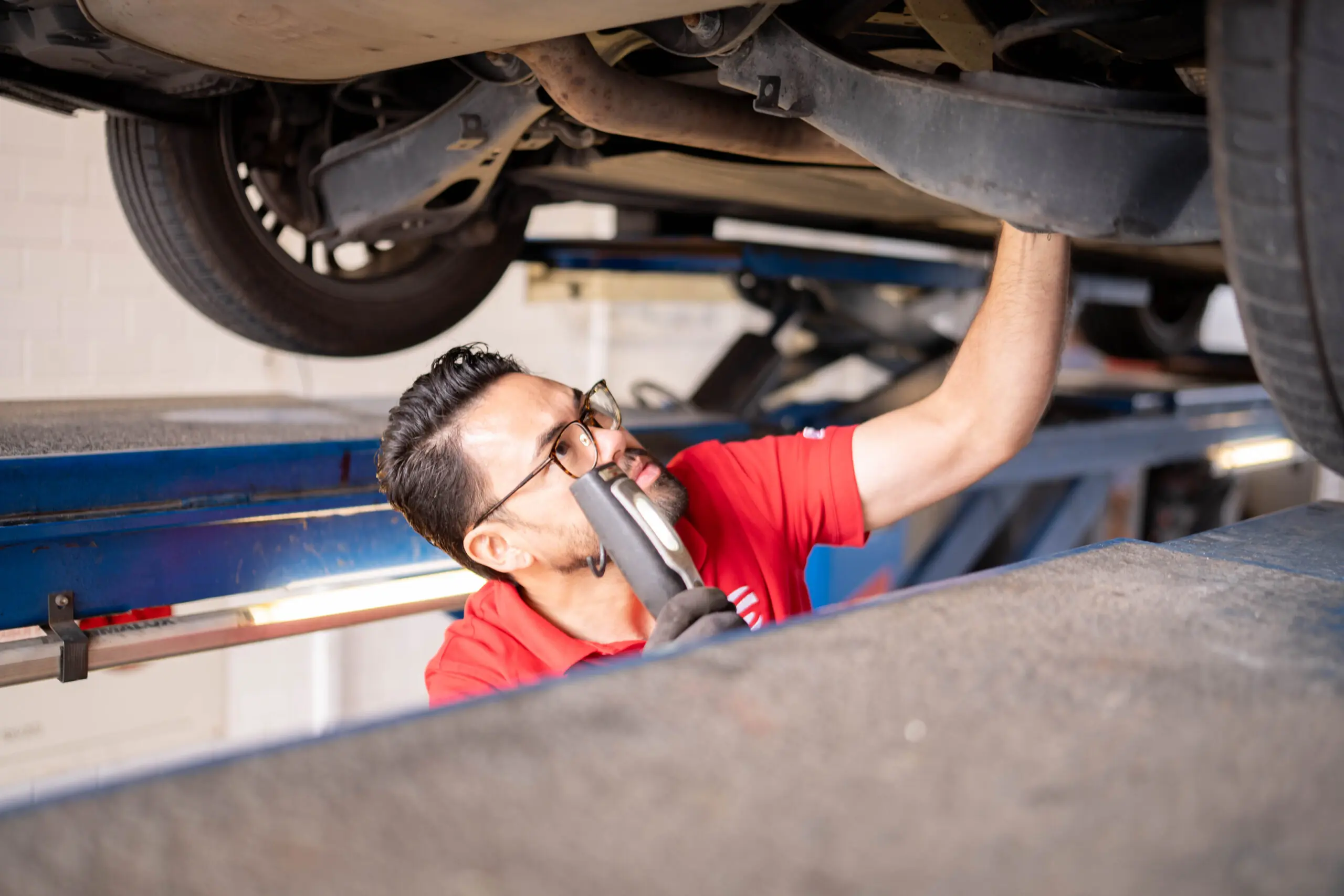 - Unterbodenprüfung: Untersuchung des Fahrwerks, der Bremsleitungen, der Auspuffanlage und weiterer sicherheitsrelevanter Bauteile auf der Hebebühne.